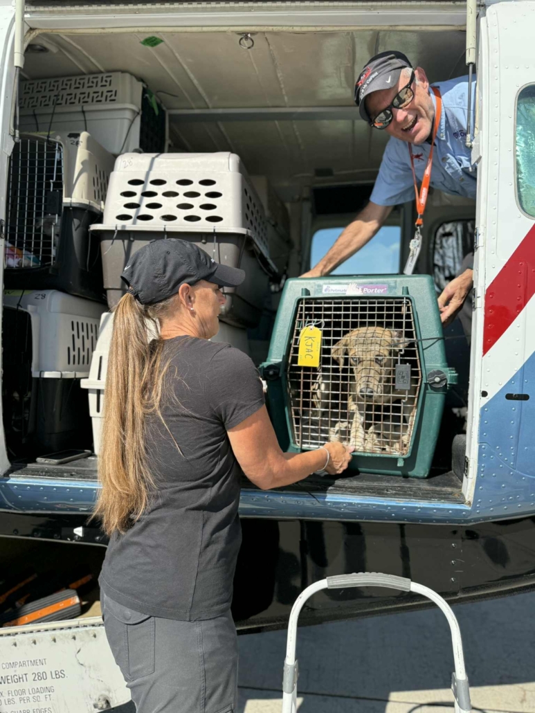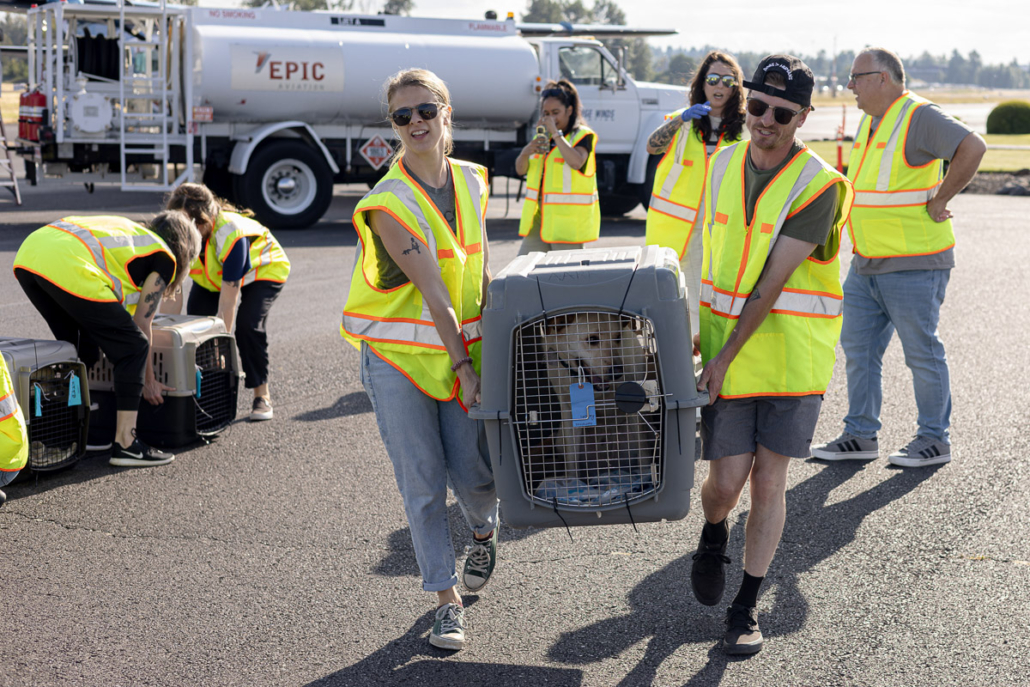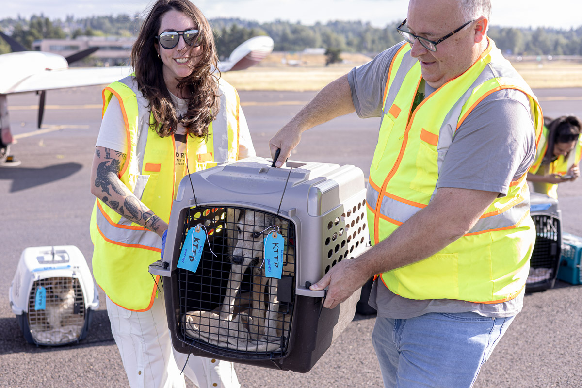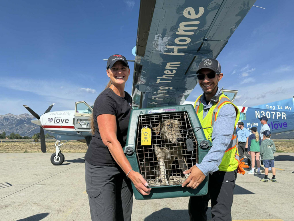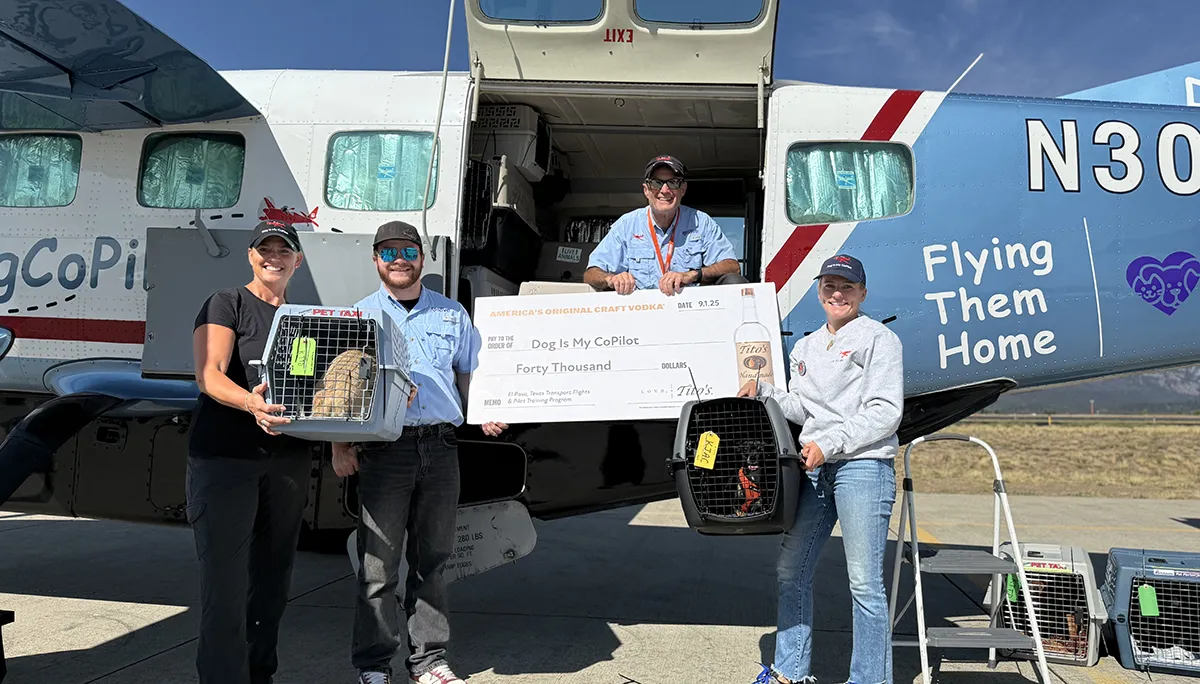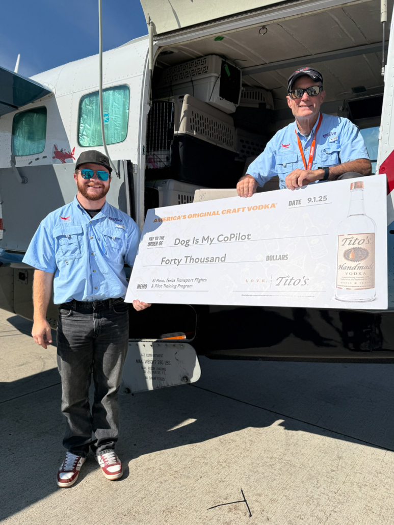 On Saturday, October 4th, the Driggs Reed Memorial Airport was buzzing with joy as a Dog Is My CoPilot (DIMC) rescue flight landed carrying more than 60 dogs. The plane’s arrival marked a special celebration, DIMC received a $40,000 gift from Tito’s Handmade Vodka, the Vodka for Dog People, to support El Paso transport flights and DIMC’s Pilot Training Program.